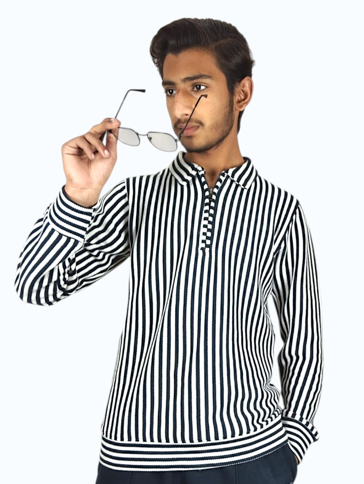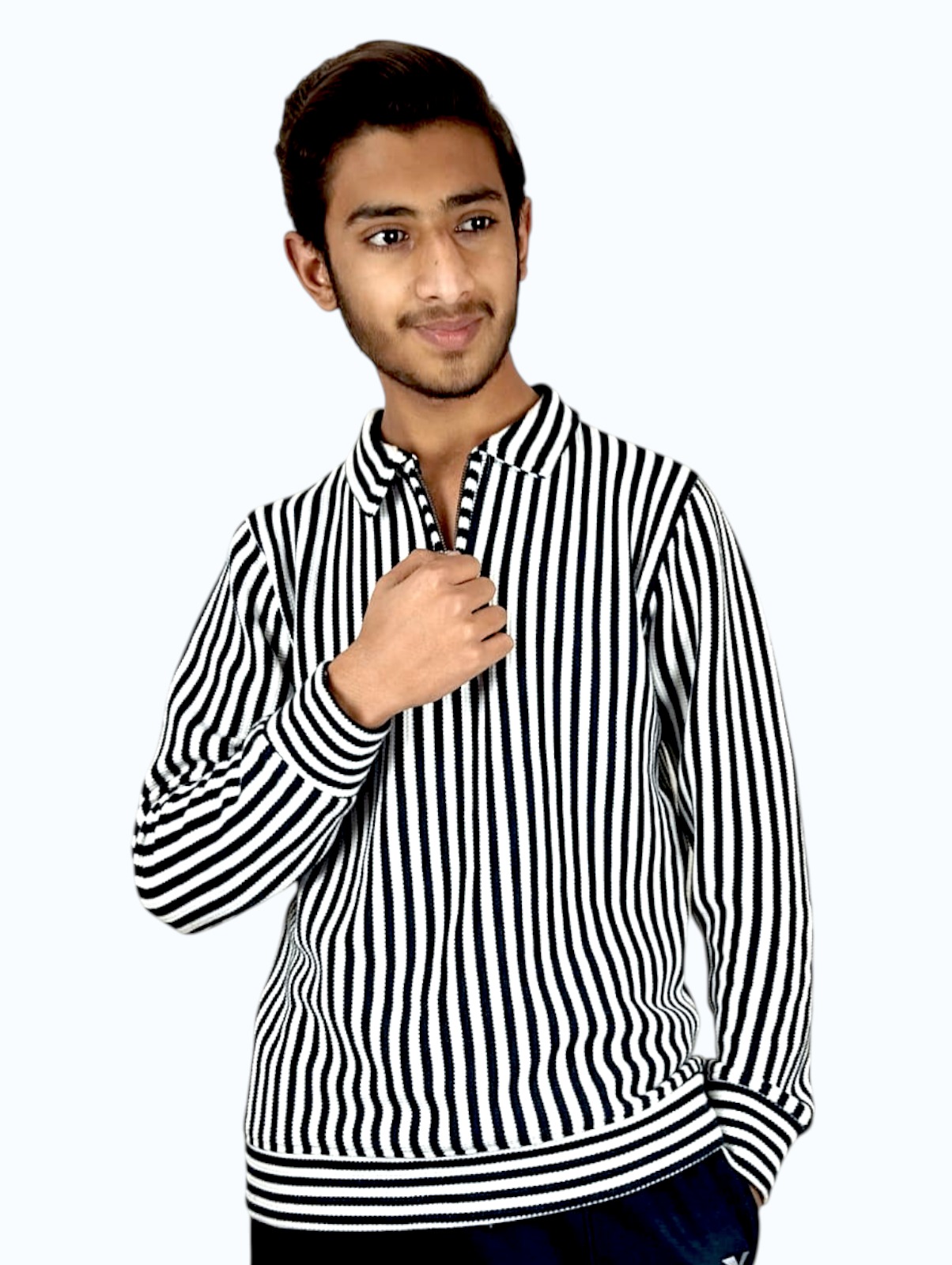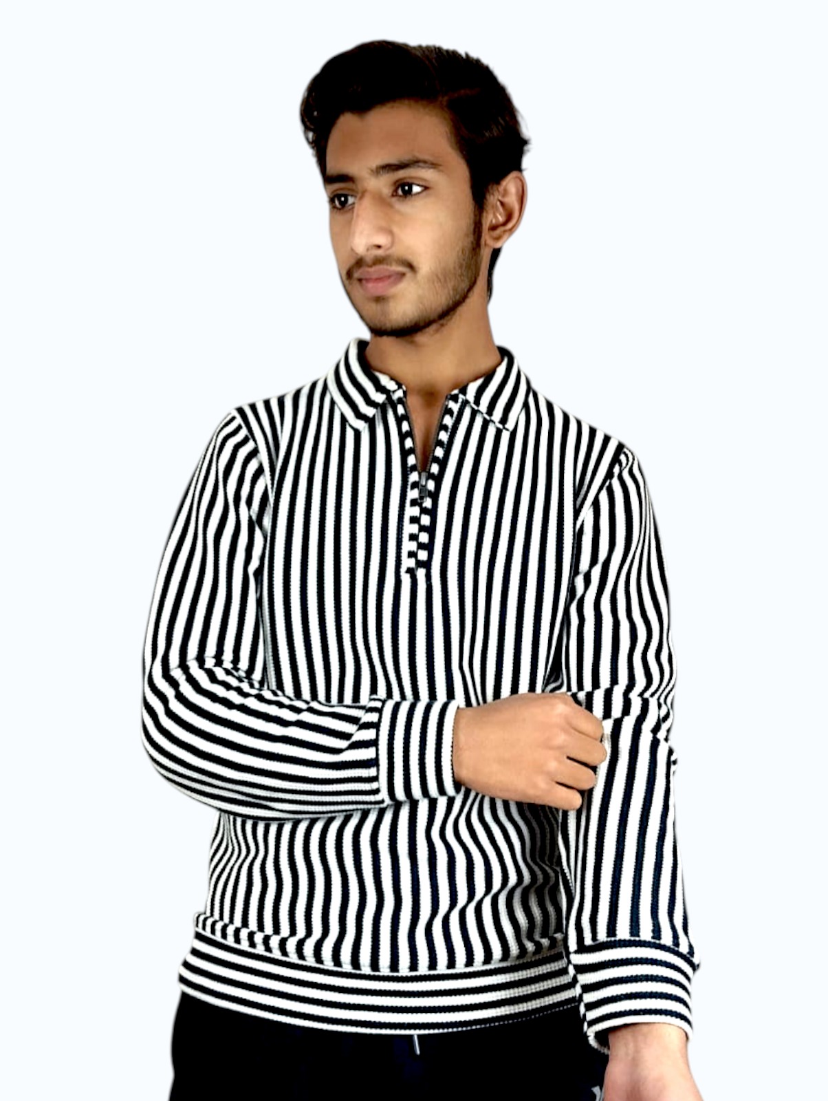 Stay warm and look sharp. The StripeCore Quarter-Zip Fleece Sweatshirt is designed for modern men who want comfort without sacrificing style during winter. The black and white striped design gives a clean, modern, and premium look, perfect for both casual and semi-casual wear.